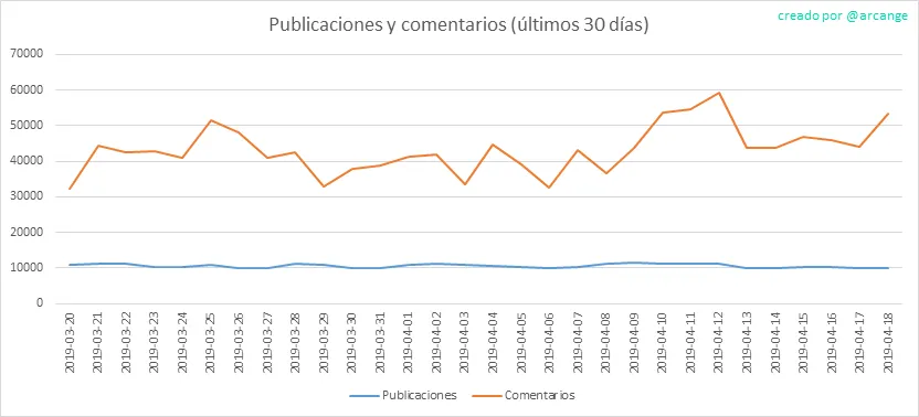 Estos gráficos muestran la evolución de las publicaciones y comentarios por el tiempo de vida útil de la blockchain y durante los últimos 30 días.