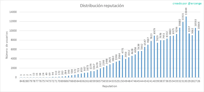 Este gráfico muestra la distribución de la reputación entre los usuarios. Las cuentas con una reputación inferior a 25 se han eliminado para mantener el gráfico legible.