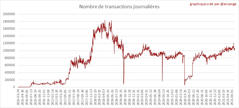 Ce graphique montre le nombre de transactions quotidiennes. Cela vous donne une idée de l’ensemble de l’activité sur la blockchain.