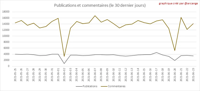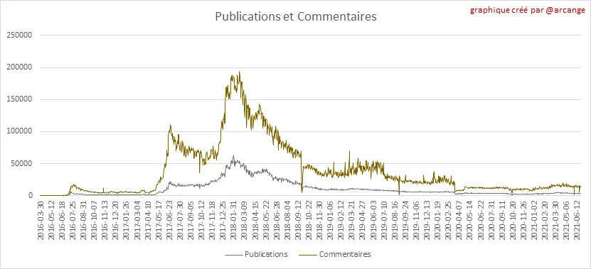 Ces graphiques montrent l'évolution des publications et des commentaires pour toute la durée de vie de la blockchain et pour les 30 derniers jours.