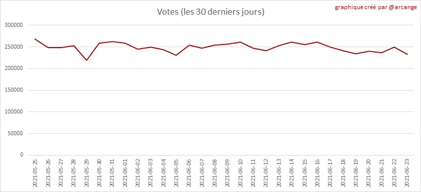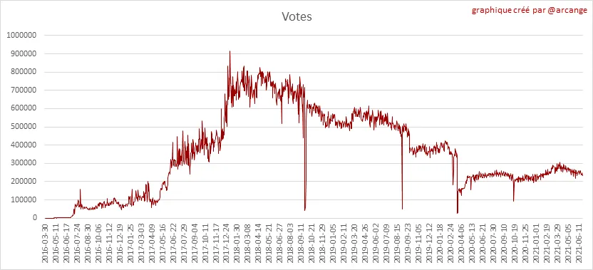 Ces graphiques montrent l'évolution de la curation (votes positifs) depuis la création de la blockchain et pour les 30 derniers jours.
