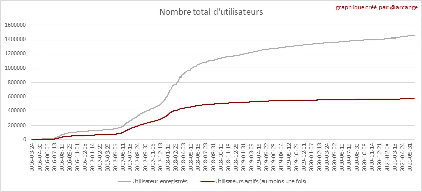 Le dernier graphique est un résumé mensuel des utilisateurs actifs. Attention en interpretant la valeur de la dernière colonne qui peut être largement inférieure si la fin du mois n'a pas encore été atteinte.