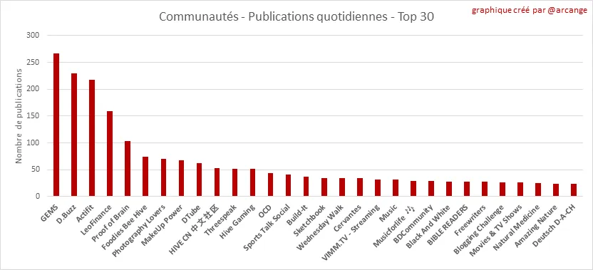 Ces graphiques montrent les communautés les plus actives en termes de publications depuis la leur création et pour le jour passé.