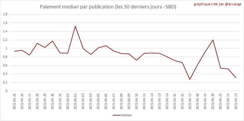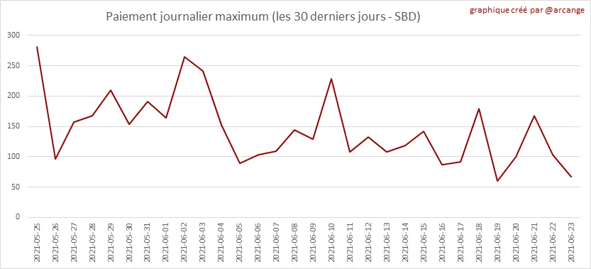 Ce graphique montrent la récompense maximale payée sur un message (ou un commentaire) au cours des 30 derniers jours.
