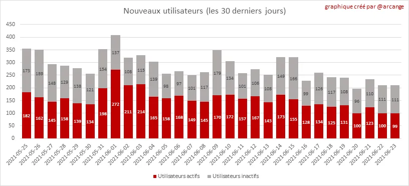 La partie grise de chaque colonne indique le nombre de comptes inactifs (ceux qui n'ont plus publié, commenté ou voté depuis 30 jours).
