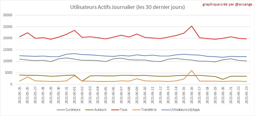 Toutes les informations présentées dans ce rapport sont basées sur les données collectées dans la blockchain jusqu'au 23-06-2021 à minuit, heure UTC. L'objectif de ce rapport est de vous fournir une vision claire de ce qui se passe quotidiennement dans la blockchain Hive.