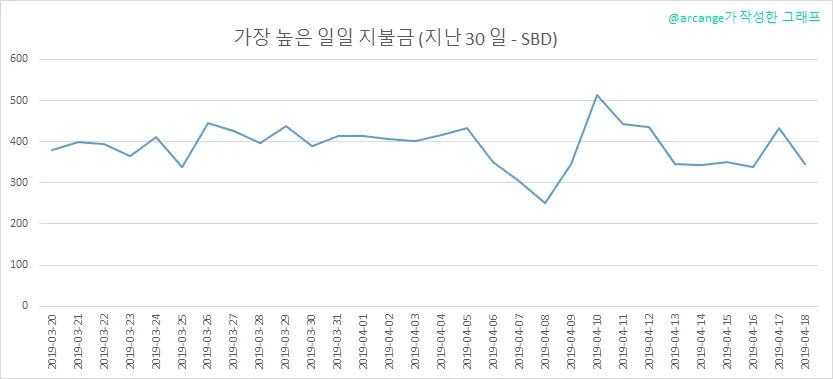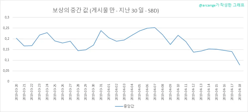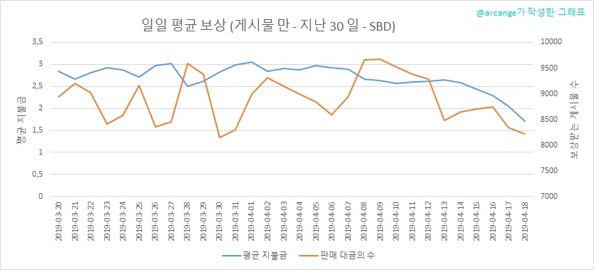 위의 그래프들은 지난 30일간 게시글당 평균 보상 금액과 중앙값(median payout)을 보여줍니다.
