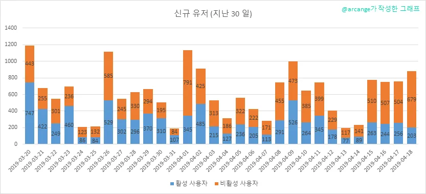 이 그래프는 스팀잇에 새로 가입한 유저 숫자와 그 중에서 얼마나 활성화가 되었는지 알려줍니다. 많은 유저들이 가입은 하지만, 실제로 사용되지는 않는다는 걸 볼 수 있습니다.
