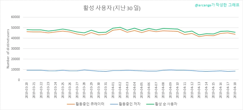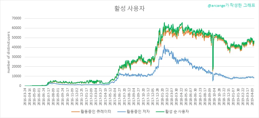 녹색선은 그 중 얼마나 많은 계정이 한번이라도 활성화 되었는지 나타냅니다. (활성화는 단 한번이라도 글, 댓글 또는 업보트를 한 계정을 말합니다.) 그들은 그들이 나중에 비활성화 될 경우에도 포함되어 있습니다.