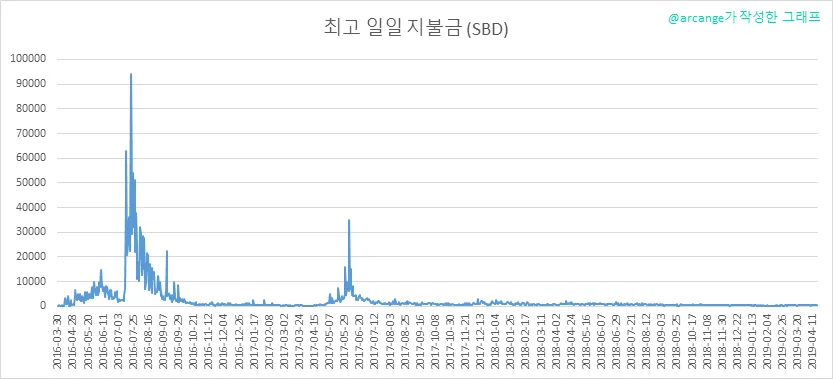 위의 그래프들은 1일간 최대 보상을 받은 포스트 (또는 댓글)의 금액을 보여줍니다 (블록체인 전체 기간과 지난 30일 간).
