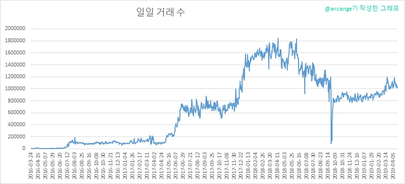 위의 그래프는 일간 트랜잭션 수를 보여줍니다. 이 그래프를 통해 블록체인의 전체 활동에 대한 아이디어를 얻을 수 있습니다.