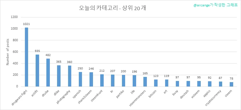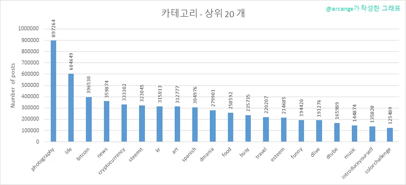이 그래프는 전체 기간 중 상위 20개 카테고리의 게시글 숫자를 보여줍니다.