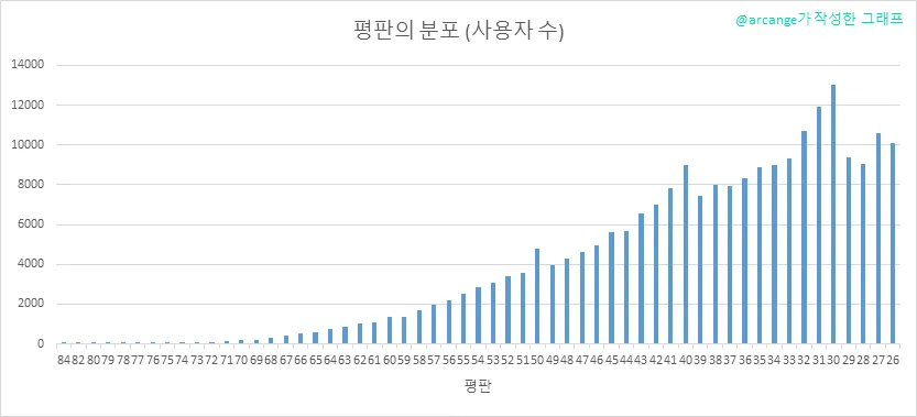 이 그래프는 평판 수치에 따른 유저들의 분포도를 보여줍니다. 25 이하의 평판을 가진 유저들은 그래프에서 제거되었습니다.