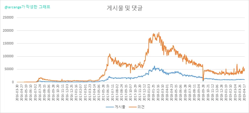위의 두 개의 그래프는 블록체인 전체 기간과 지난 30일간의 포스트와 댓글 수를 보여줍니다.