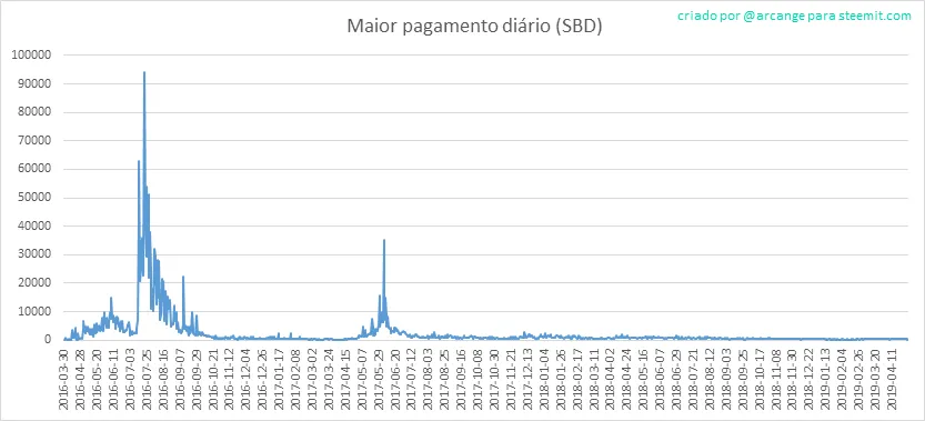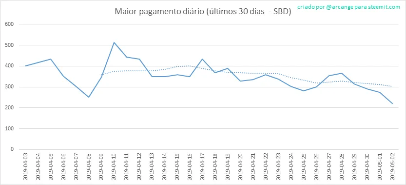 Este gráfico mostra o máximo de recompensa pago por um post (ou comentário), em cada dia (durante todo funcionamento da blockchain e os últimos 30 dias)