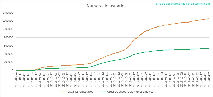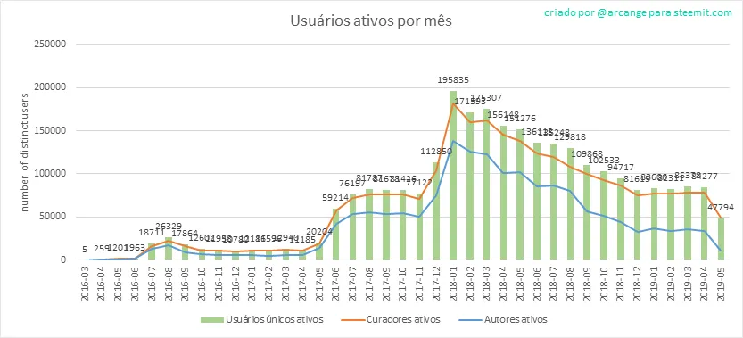 O último gráfico é um resultado mensal dos usuários ativos. Isso permite comparar o valor do blockchain Steem para aqueles que costumam postar em outras redes sociais.