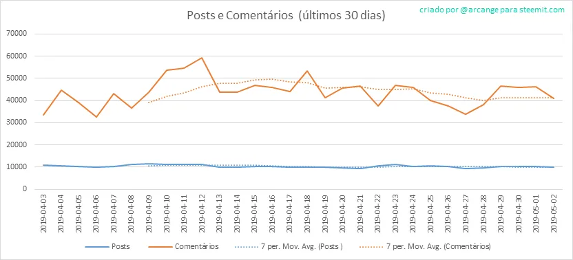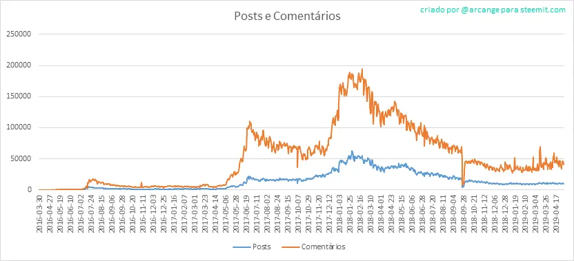 Esses gráficos mostram a evolução dos posts e comentários desde o início da blockchain e dos últimos 30 dias.