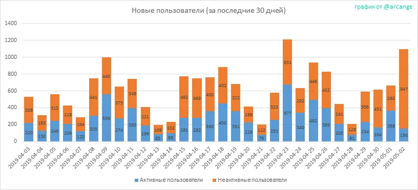 Внимание: этот график является динамическим! Пользователь может зарегистрироваться в один день и стать активным несколько дней спустя. Таким образом, количество активных пользователей за конкретные даты может измениться со дня на день.