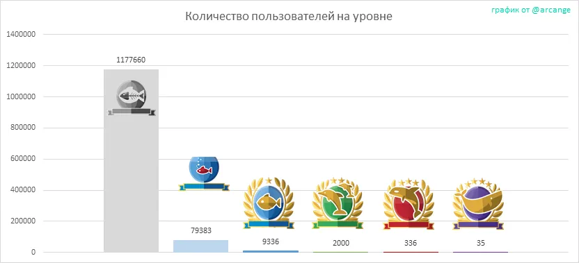 Этот график показывает количество пользователей в зависимости от их ранга. Он включает также неактивных пользователей