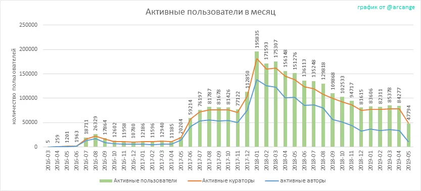Зеленая линия показывает, сколько пользователей были активны, по крайней мере, один раз ("активный пользователь", означает, что он написал по крайней мере одно сообщение, комментарий или проголосовал). Активный пользователь включается в график, даже если позже он становится неактивным.