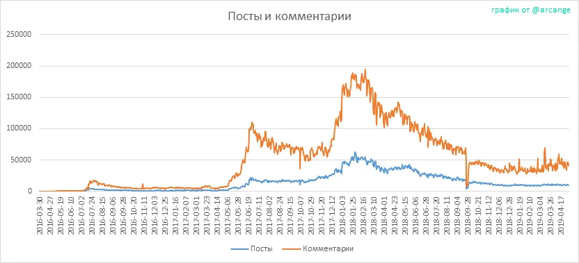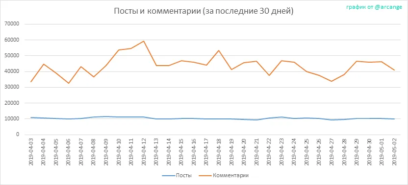 Эти графики показывают изменения количества постов и комментариев, с момента создания и в течение последних 30 дней.