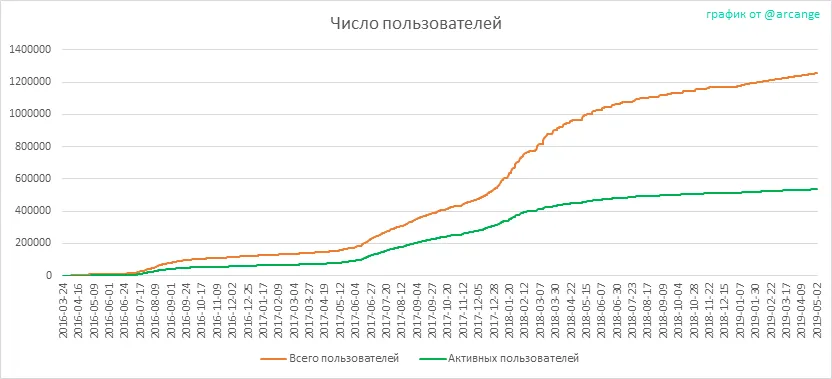 Этот график показывает количество новых пользователей, зарегистрированных на Steem и сколько из них стали активными. Мы видим, что многие пользователи зарегистрировали аккаунты, но они никогда не используются.