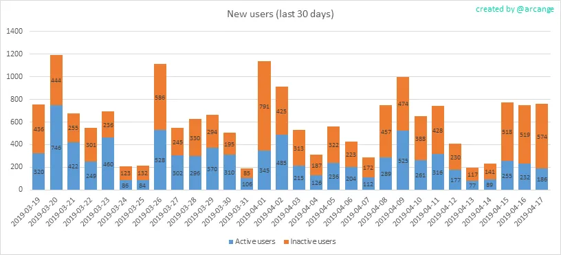 This chart shows the number of newly registered users on the blockchain and how many of them became active. We see that a lot of accounts are registered, but never used.