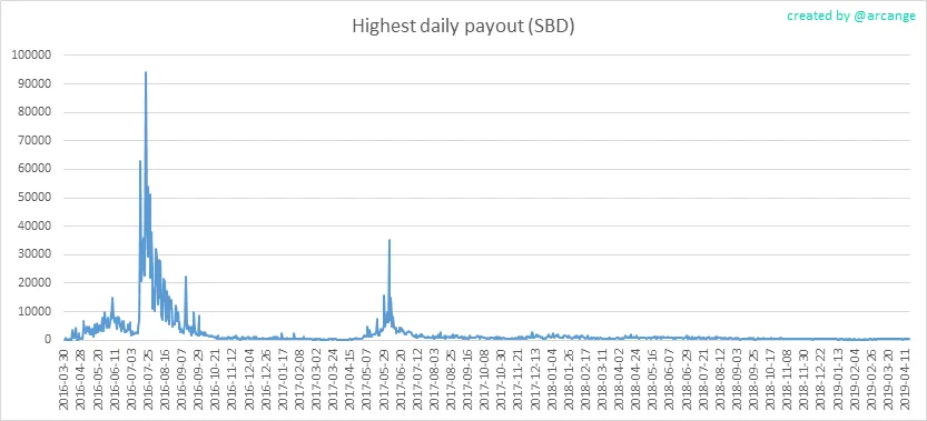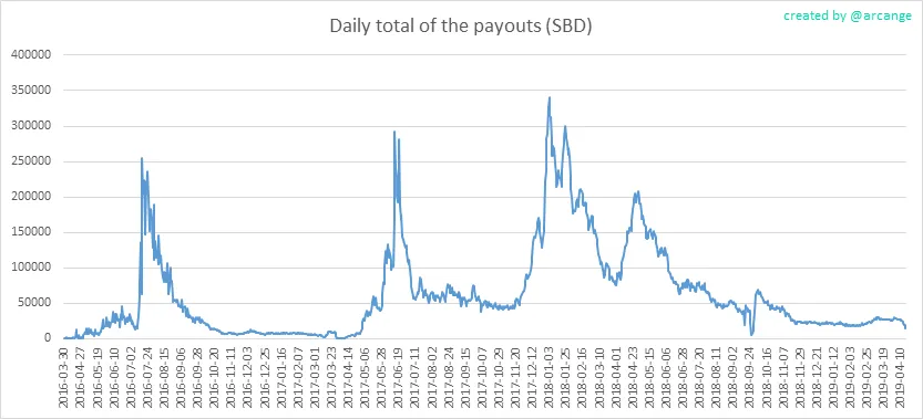 These graphs show the total of the distributed payout (posts and comments) for each day.
