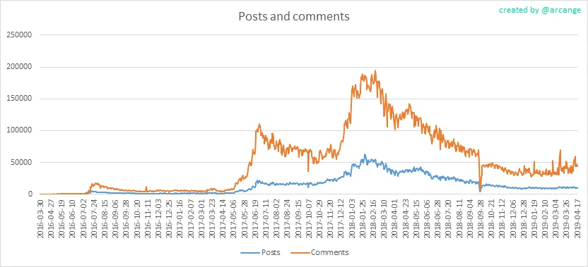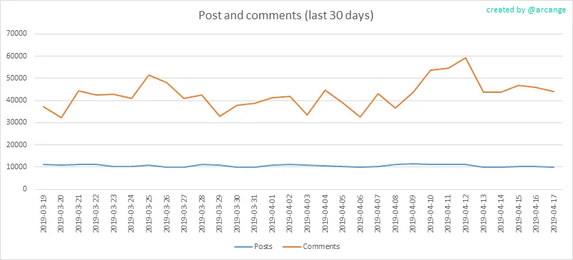 These graphs show the evolution of posts and comments for the whole blockchain lifetime and for the last 30 days.