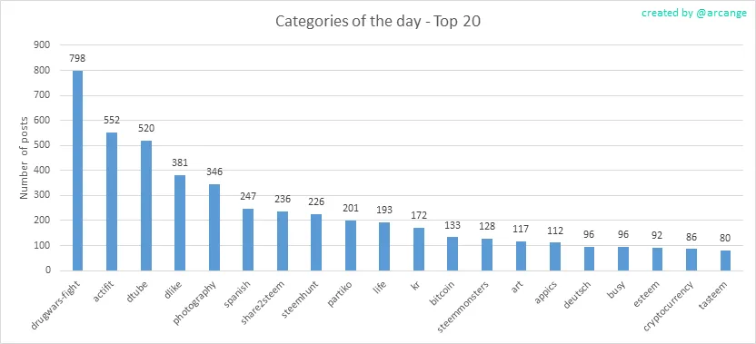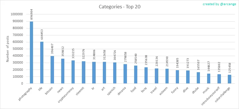 This graph shows the tag has been the most used for publishing posts for the whole blockchain lifetime.