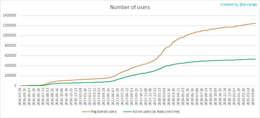 In this graph, the orange line shows the total number of registered accounts.