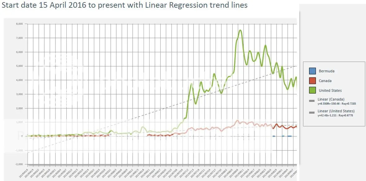 We can see a slow downward trend over the last month, however this is not alarming. Just as with the price spike and subsequent bloodletting. The user spike was preceded by a number of spikes closely correlated with the hype phases indicated by the spikes in the blue lines.