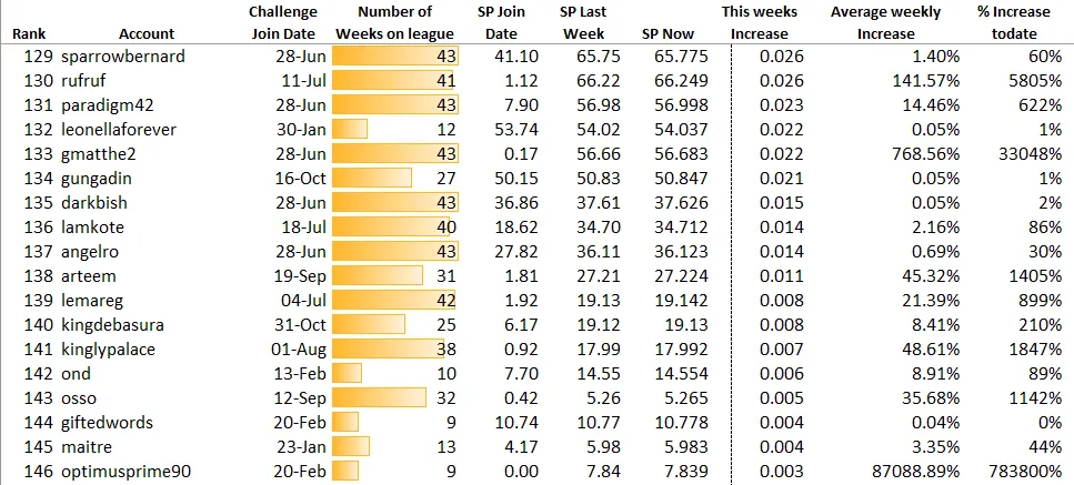 Every Wednesday I will be connecting to the SteemSQL database managed by @arcange and gathering details on the Owned SP for each person in the league.The current weekly owned SP will be compared to the SP held when the person joined the league and the average weekly % SP growth will be calculated. The person with the highest % weekly SP growth will be on top of the league. When a person reaches owned SP of 500, they will be removed from the league and added to the Wall of Fame.