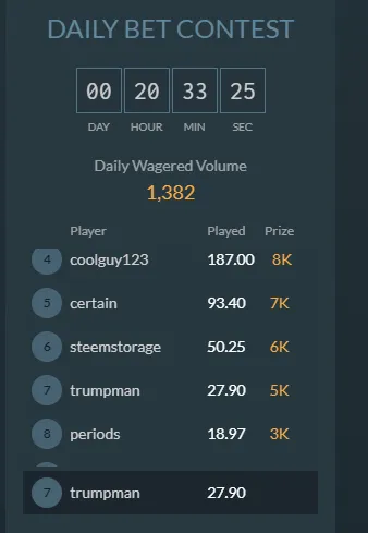 It's only a pity it isn't getting more love from Steemians, especially considering the house edge is just 1%. I am sure many here like to gamble but probably don't know of it or whatever. I mean, I like to bet only small amounts and do it purely from fun. And just by playing for 20 minutes and wagering a joke amount (just 27 steem, which is like 3 $) I am already in the top-10 wagers and a candidate to win 7k EPC: