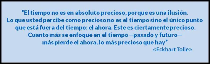 Tolle plantea a lo largo de varios capítulos como la conceptualización del tiempo nos distrae del ahora. El presente cuando lo piensas ya es pasado; el hoy se vuelve “largo tiempo”. El único momento, del cual eres dueño y sobre el que puedes actuar real y conscientemente es éste ahora.