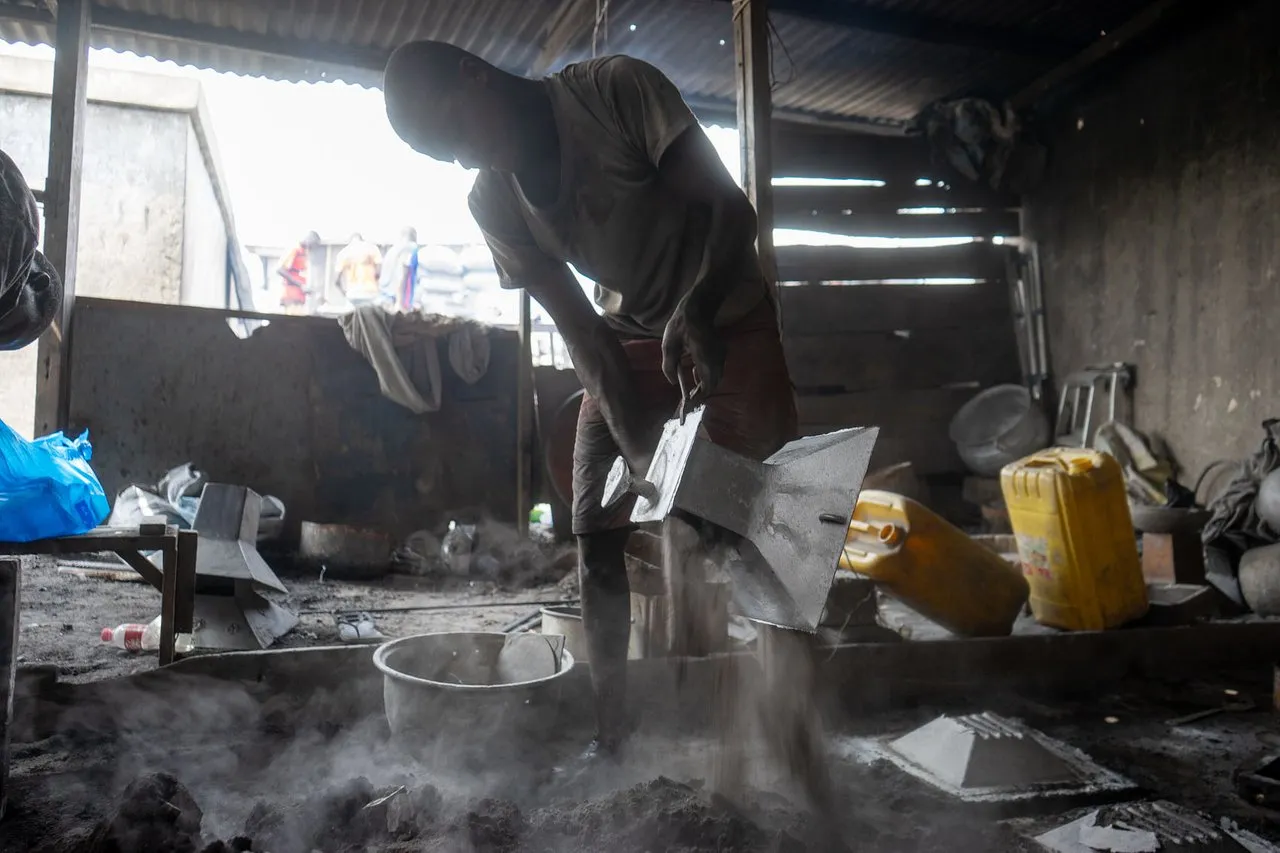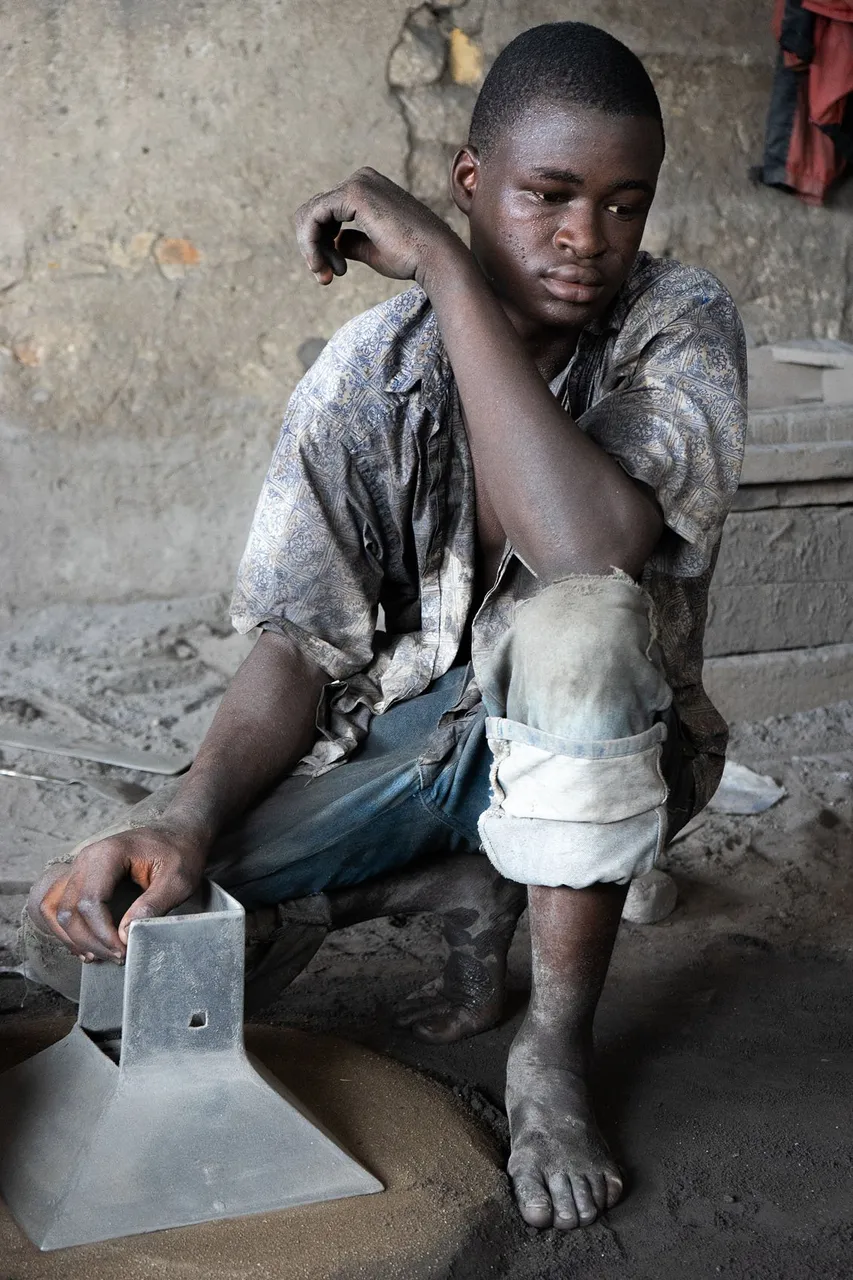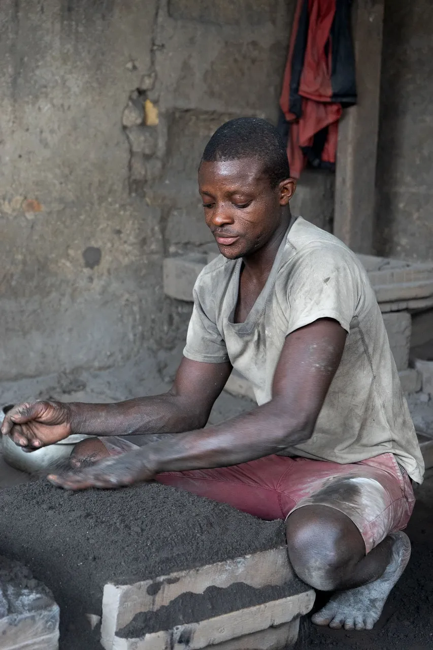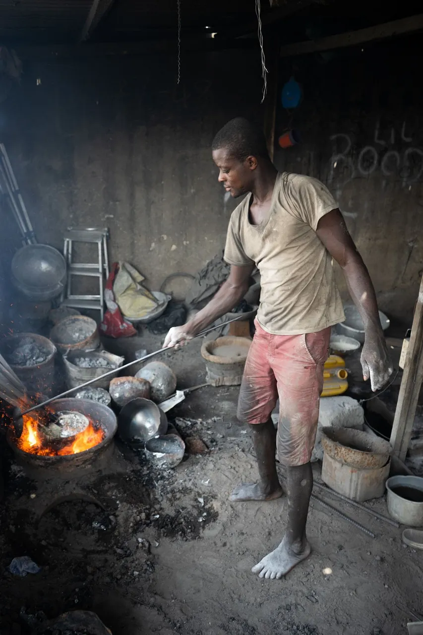 The lucky subjects of our attention were a couple guys holed up in a hut, in the back alleys of Jamestown. In conditions that are cramped and hot, but unbelievably photogenic, an apprentice and his master produce up to 50 aluminum coal pots per day. These funnel-shaped containers hold burning coals, and can be used to boil bowls of stew or grill meat skewers. They're among the simple tools you see people in Ghana using every day, but never pay much mind to.