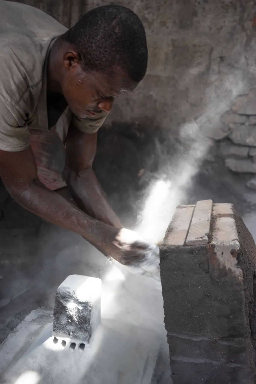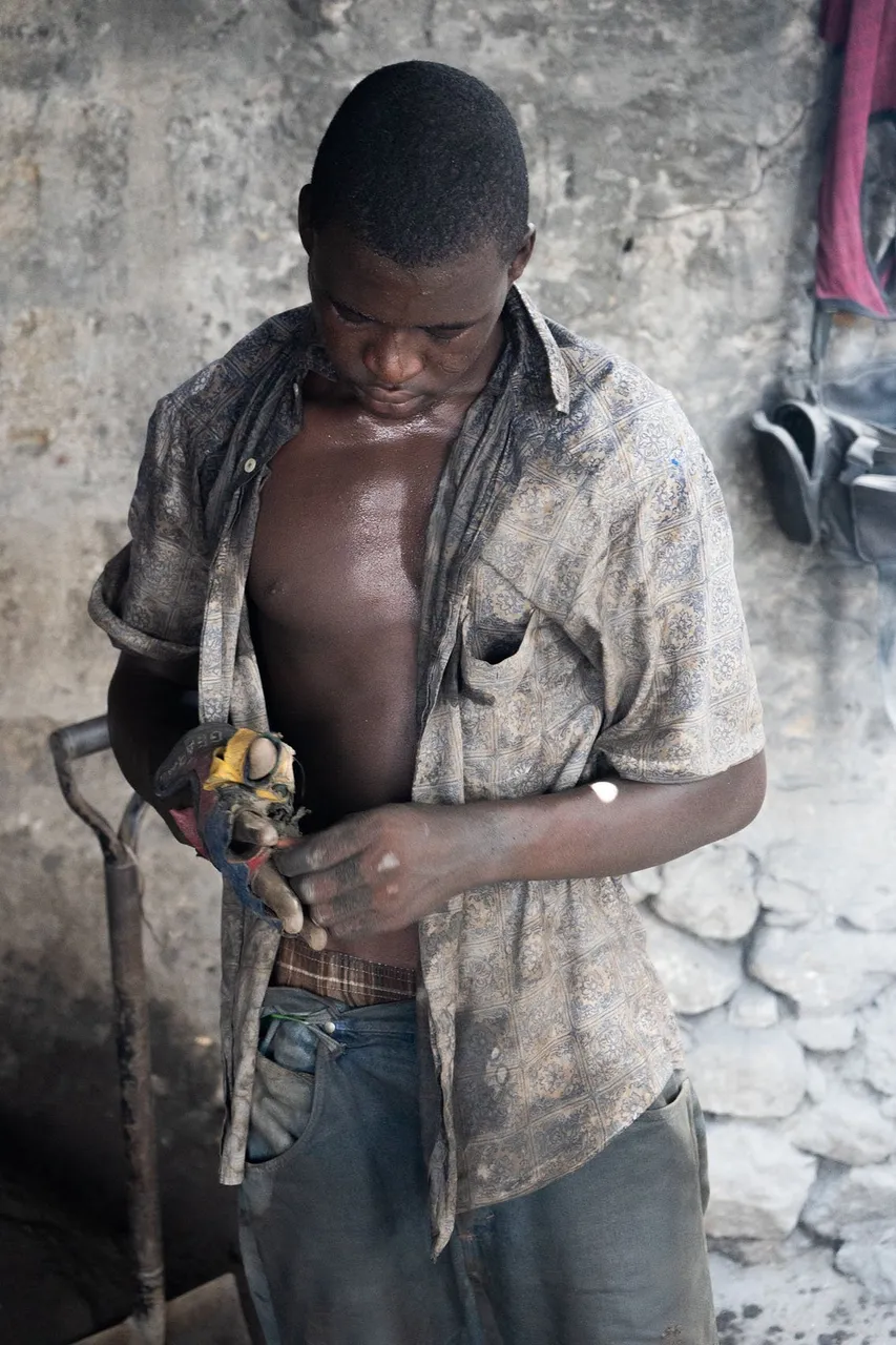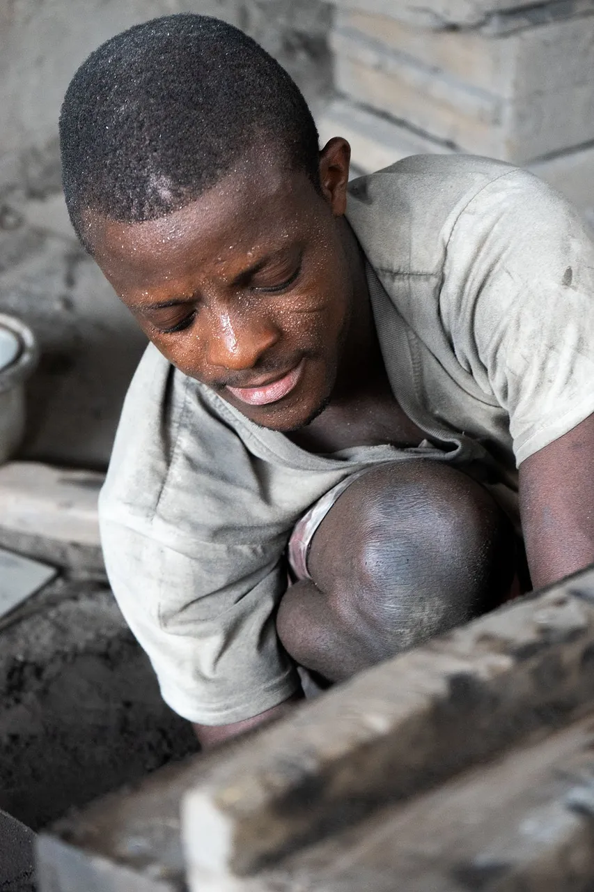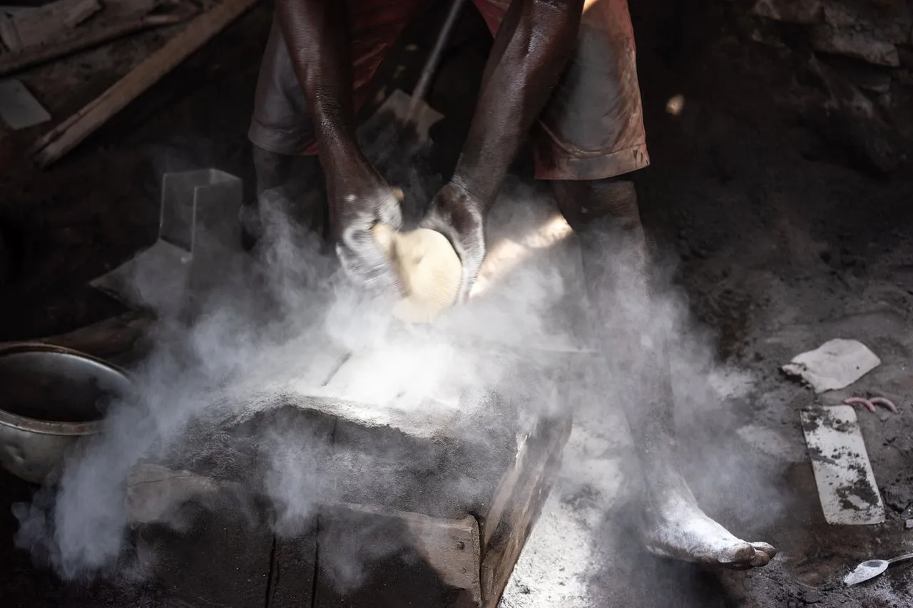 The lucky subjects of our attention were a couple guys holed up in a hut, in the back alleys of Jamestown. In conditions that are cramped and hot, but unbelievably photogenic, an apprentice and his master produce up to 50 aluminum coal pots per day. These funnel-shaped containers hold burning coals, and can be used to boil bowls of stew or grill meat skewers. They're among the simple tools you see people in Ghana using every day, but never pay much mind to.