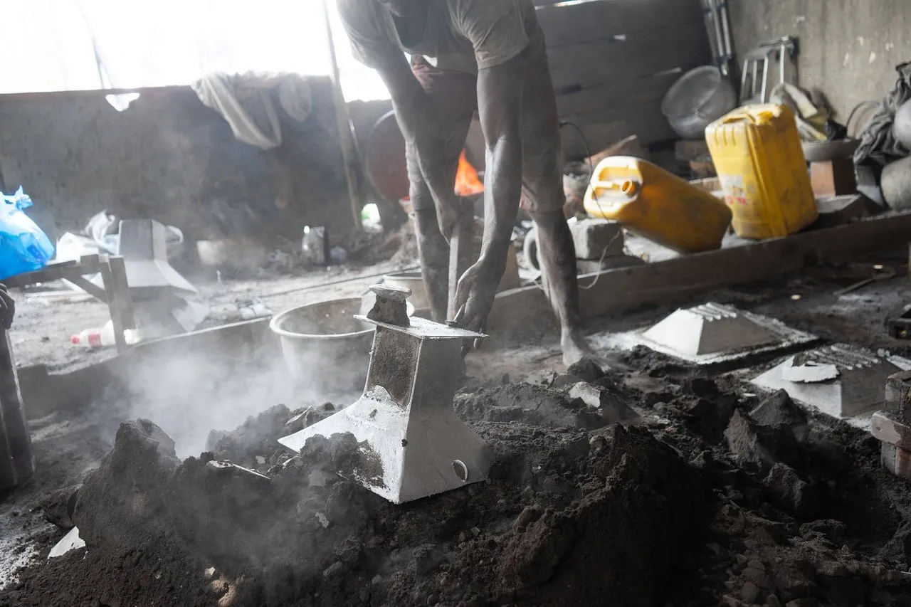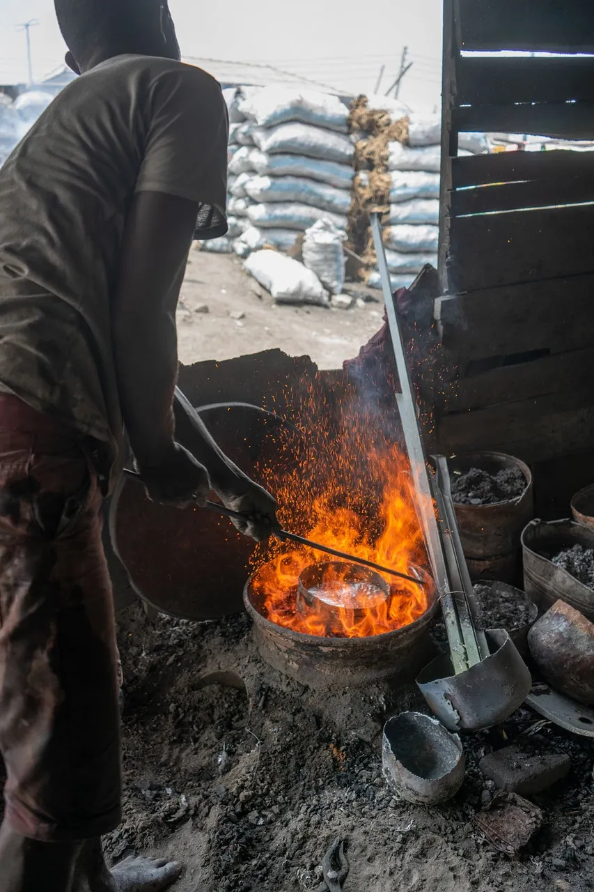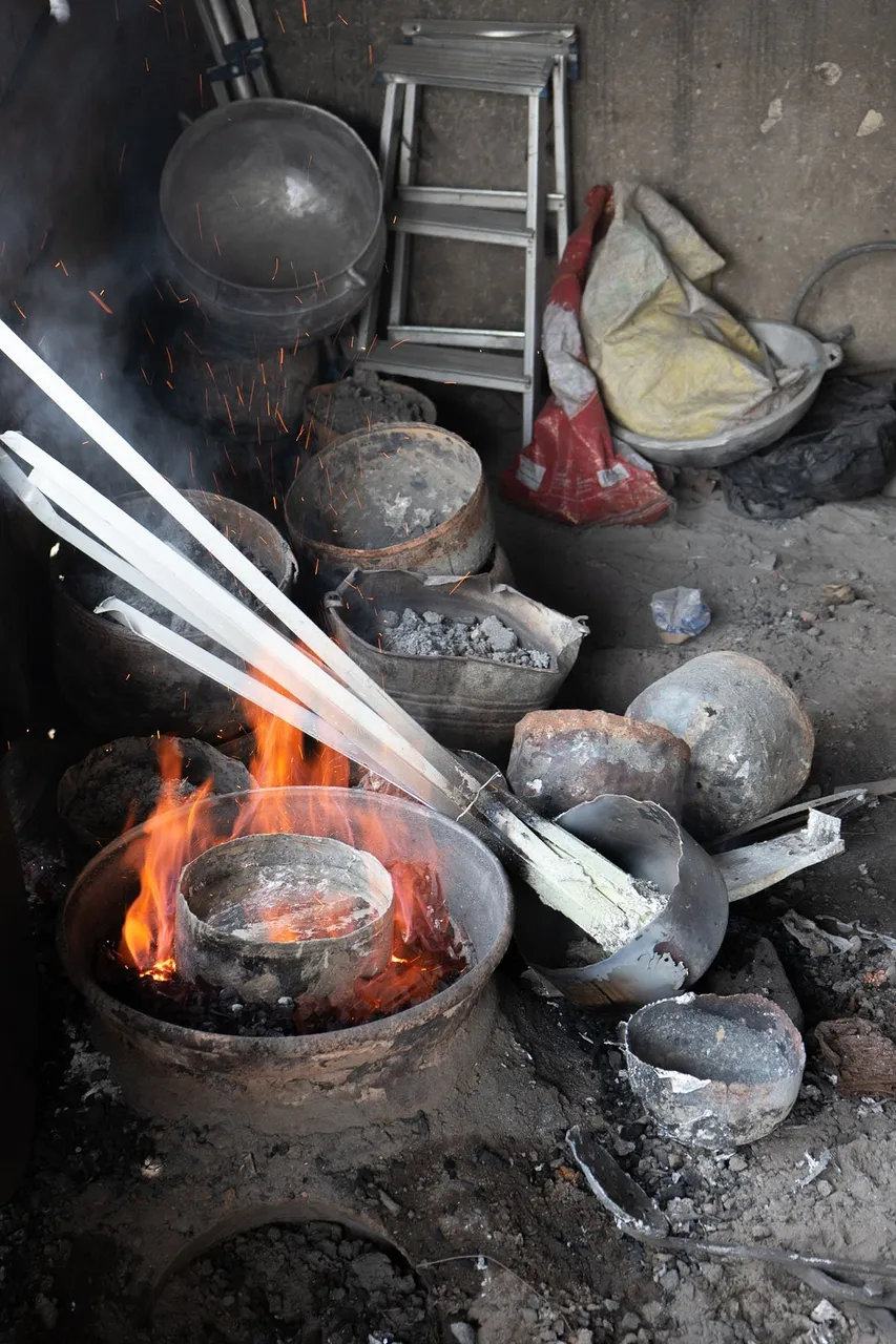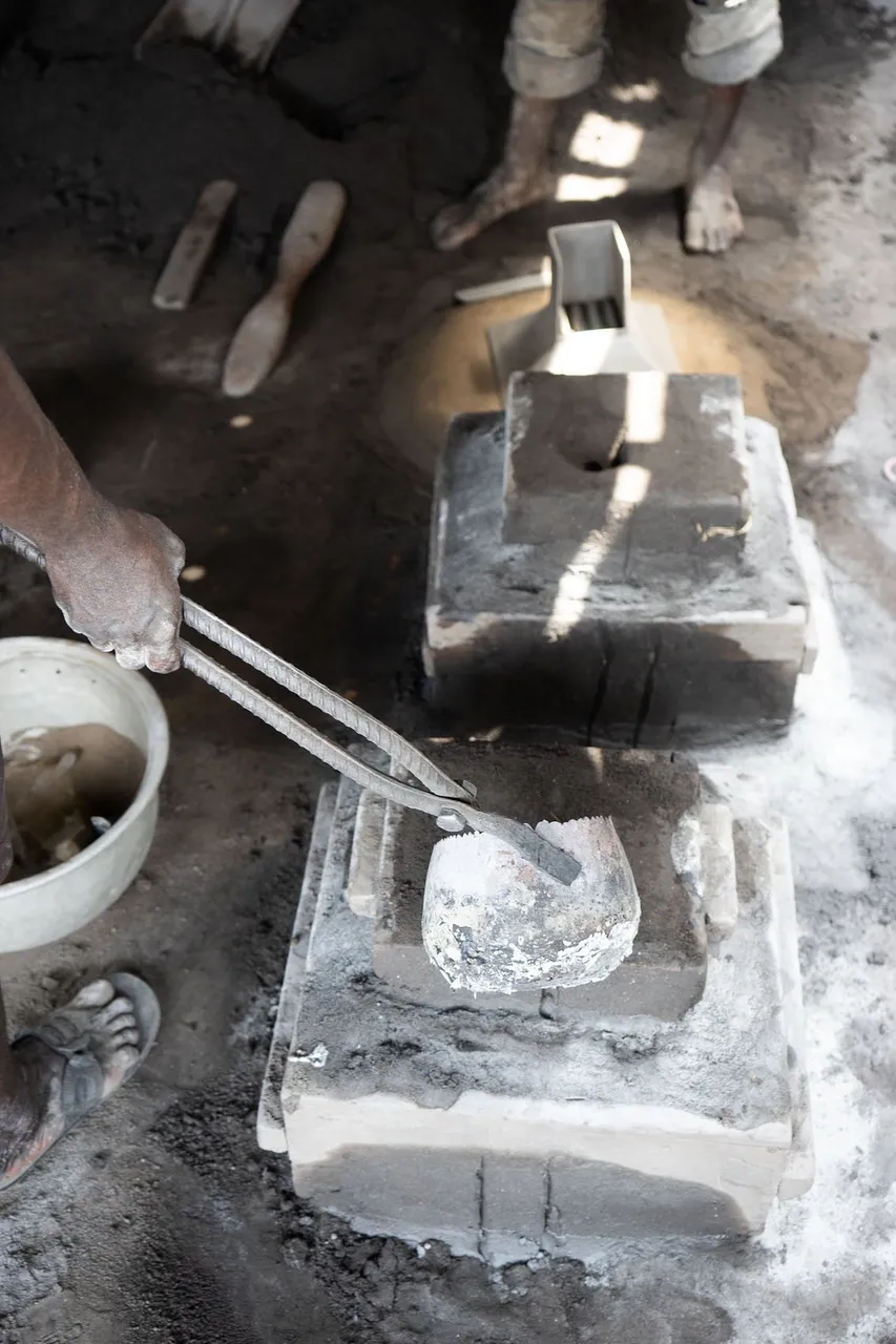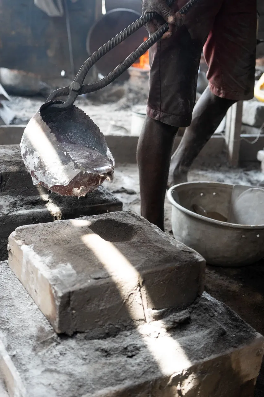 The production process is pretty straight-forward. Inside the hut, they had a little makeshift oven made of bricks, assisted with an electric fan, which is used to melt the aluminum needed for their work. This aluminum is junk metal purchased at bargain prices at scrapyards around Accra... notably the massive electronic dumping ground near Agbobloshie Market.