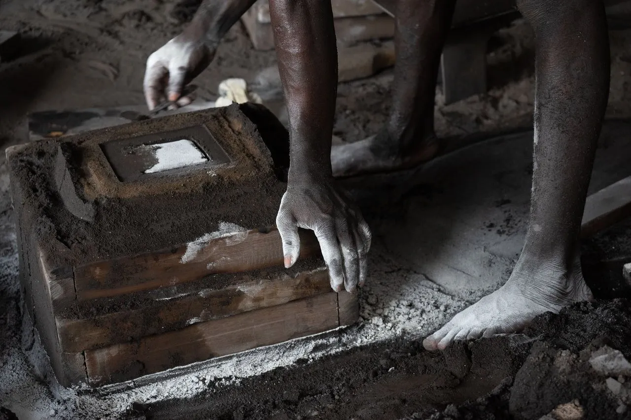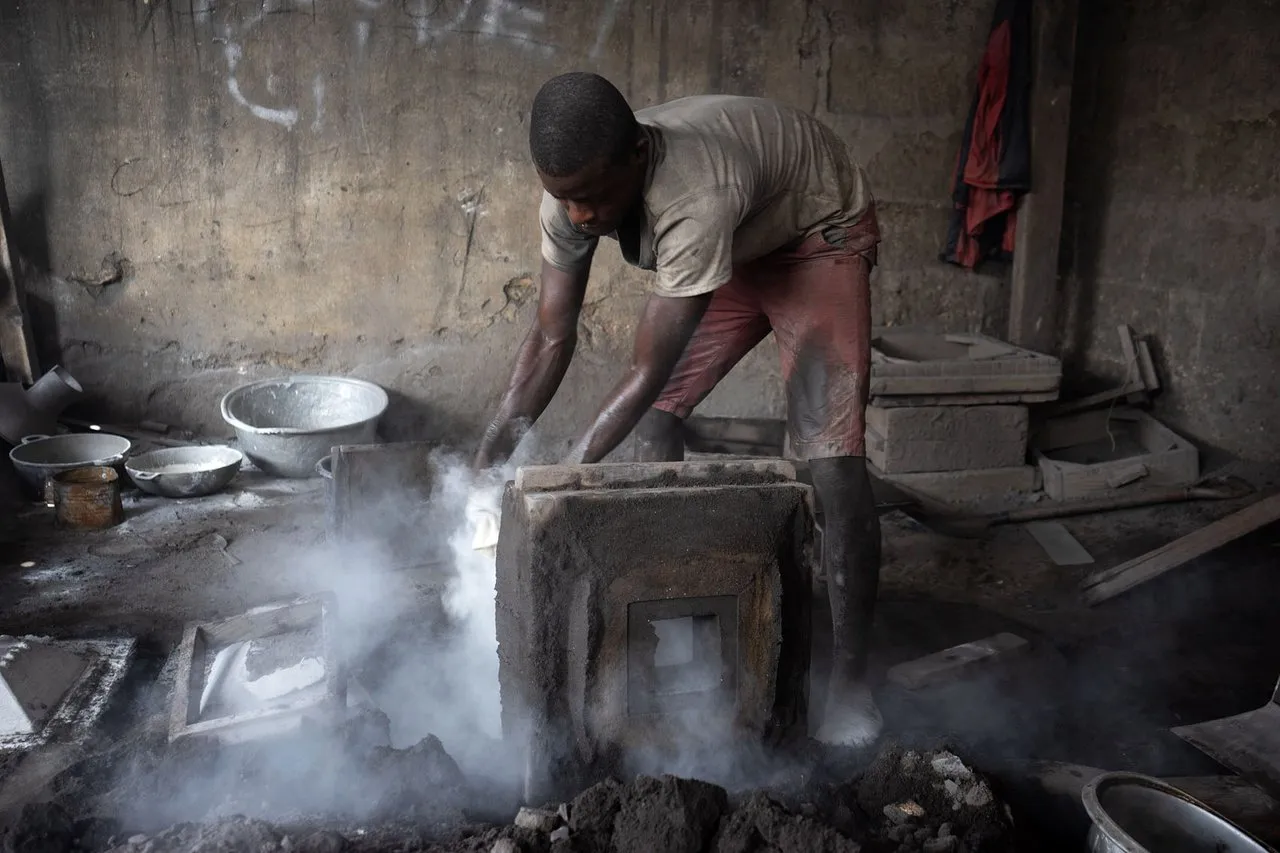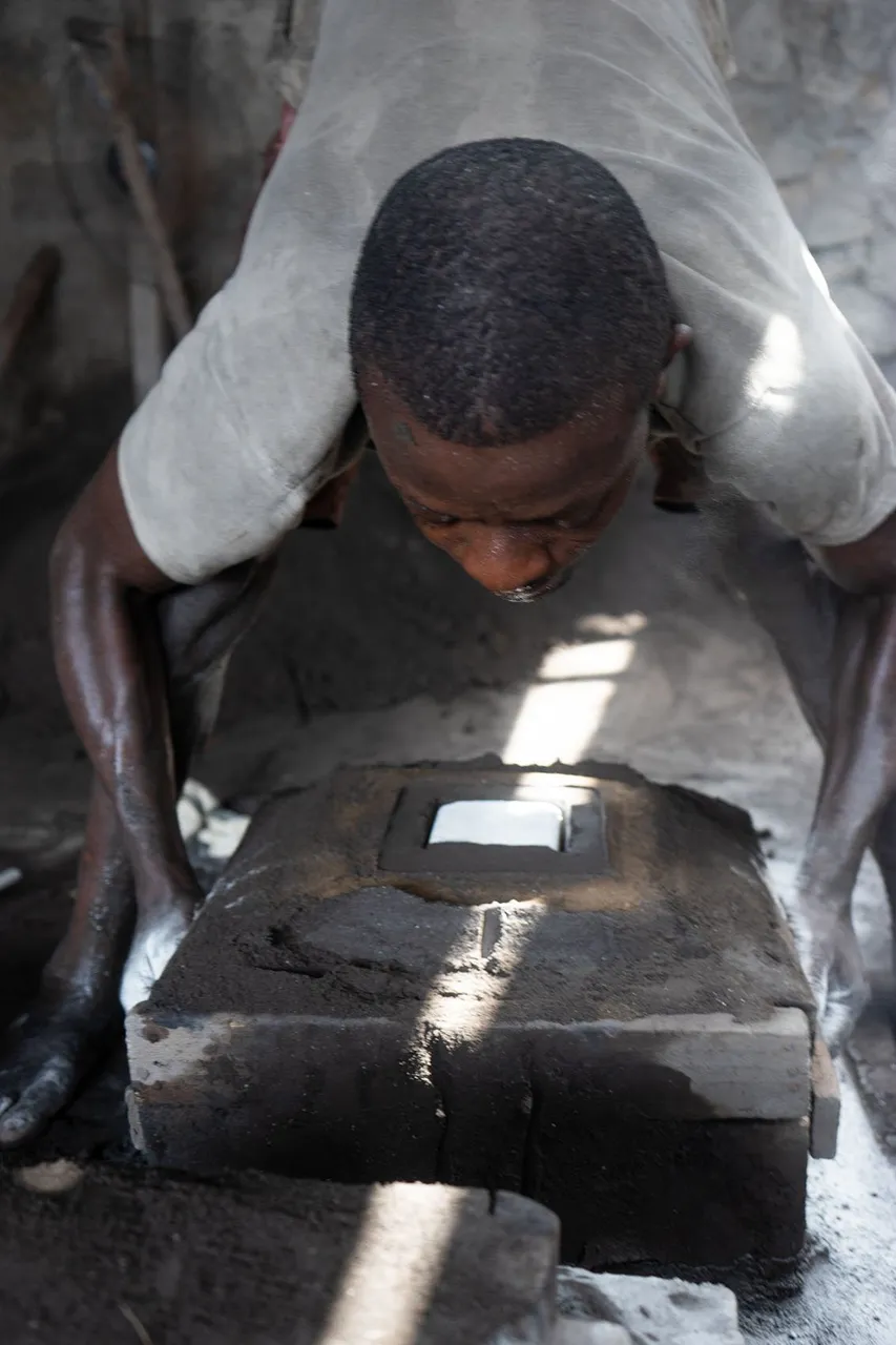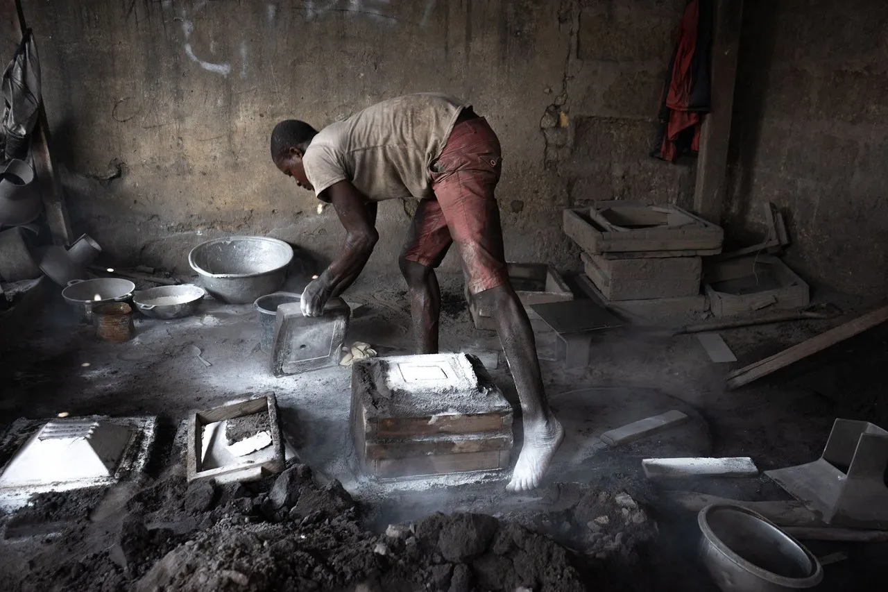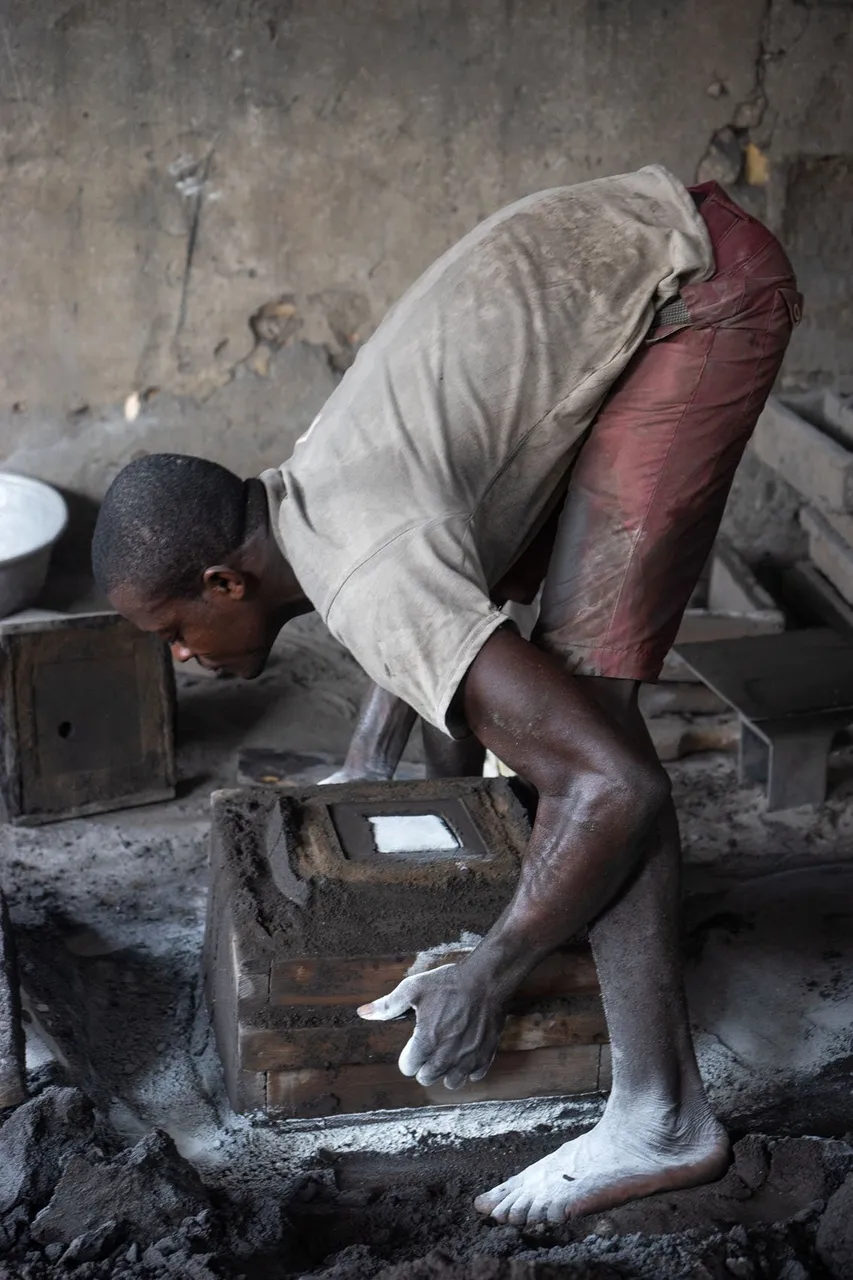 The production process is pretty straight-forward. Inside the hut, they had a little makeshift oven made of bricks, assisted with an electric fan, which is used to melt the aluminum needed for their work. This aluminum is junk metal purchased at bargain prices at scrapyards around Accra... notably the massive electronic dumping ground near Agbobloshie Market.