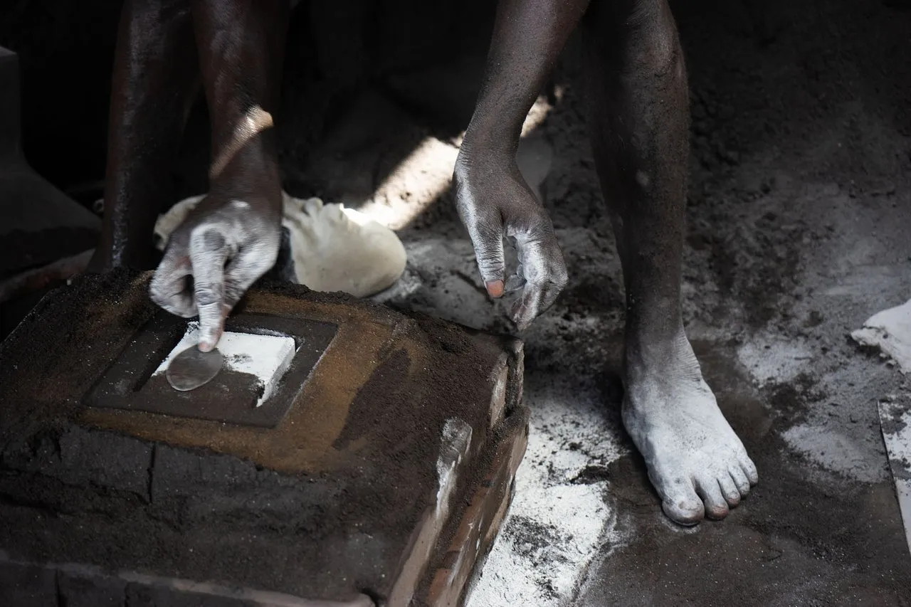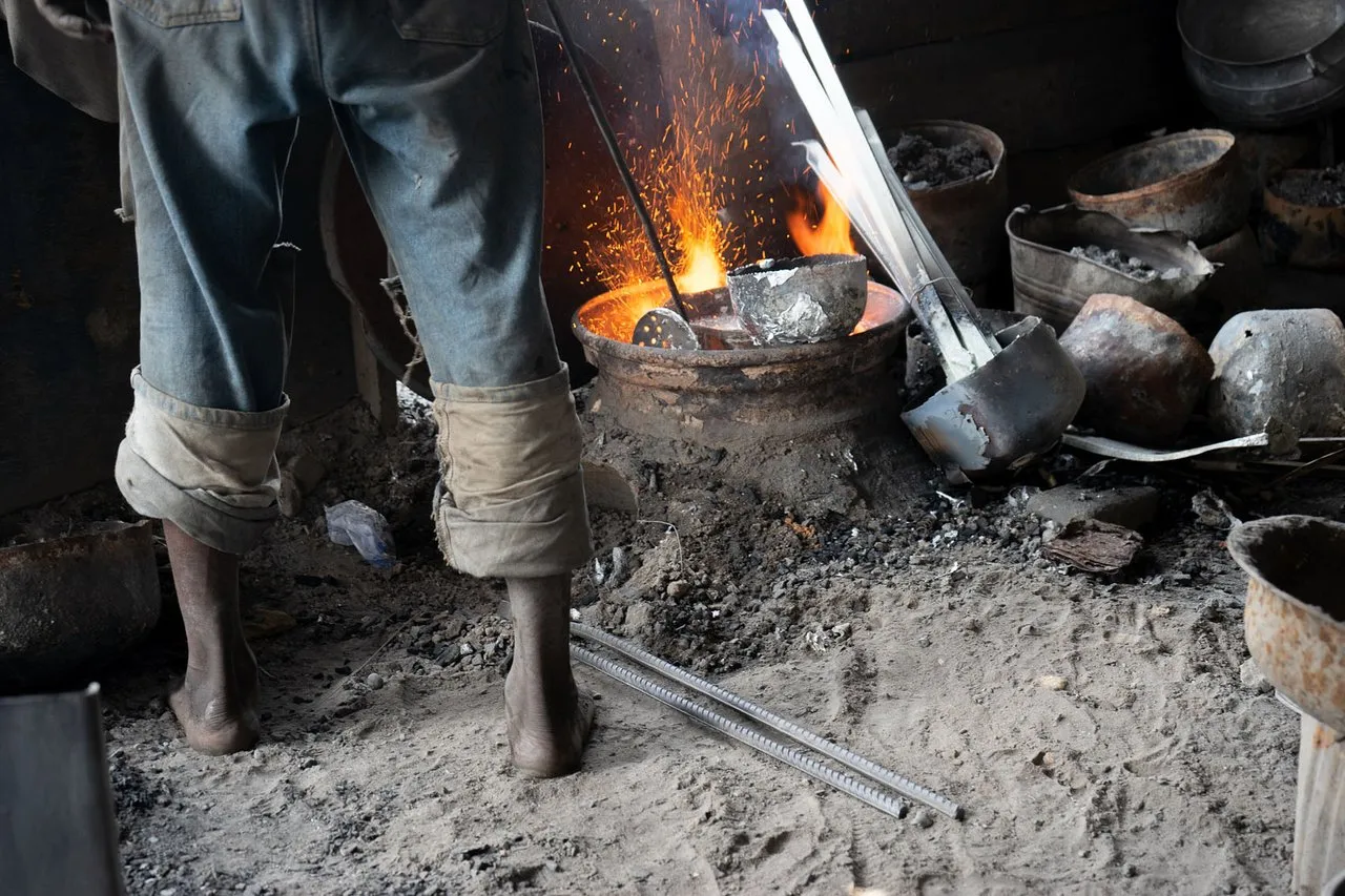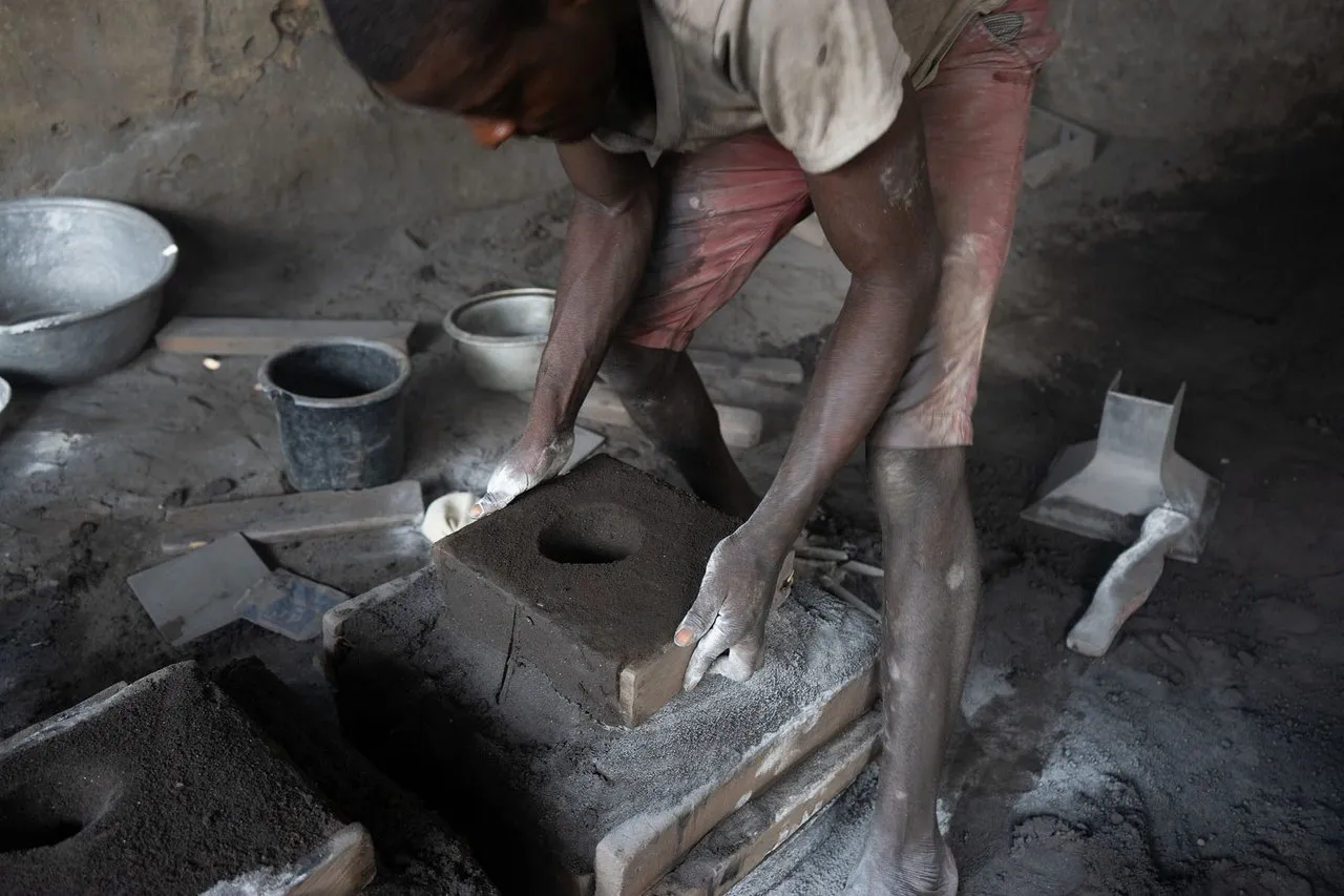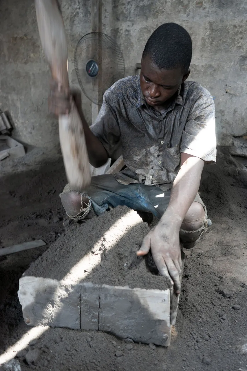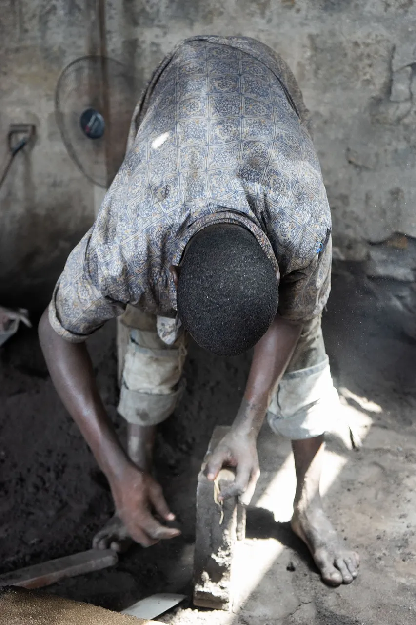 The production process is pretty straight-forward. Inside the hut, they had a little makeshift oven made of bricks, assisted with an electric fan, which is used to melt the aluminum needed for their work. This aluminum is junk metal purchased at bargain prices at scrapyards around Accra... notably the massive electronic dumping ground near Agbobloshie Market.