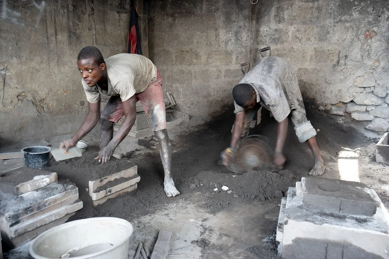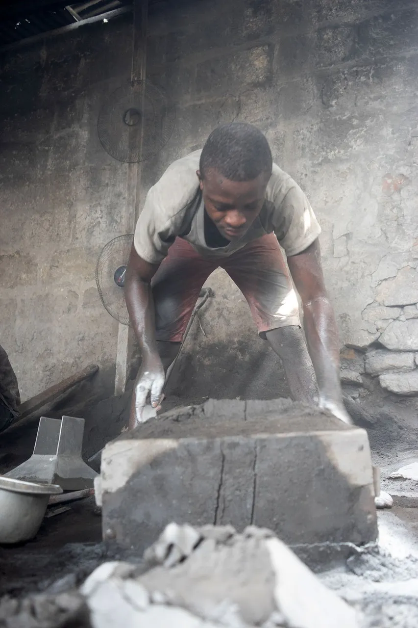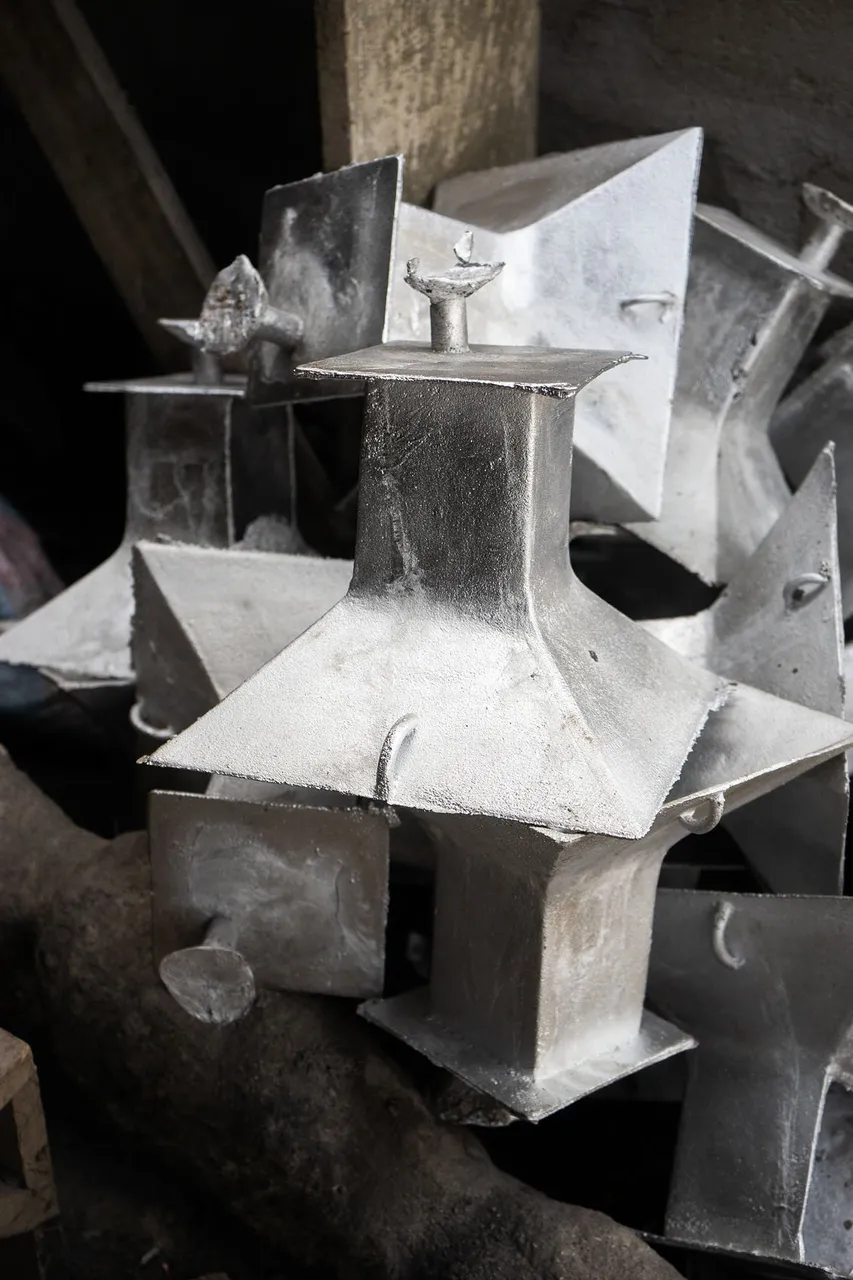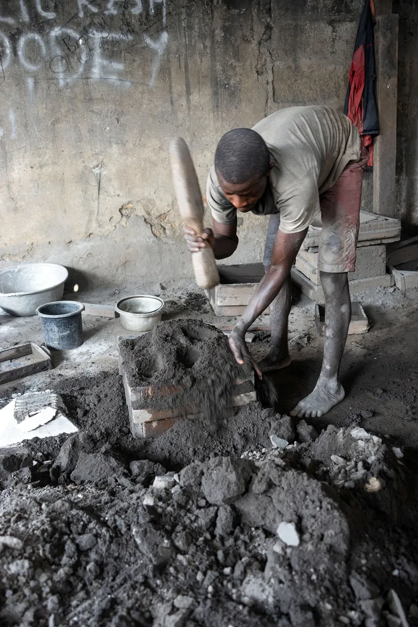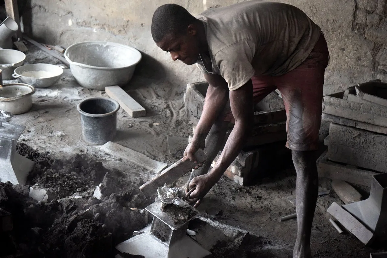 The production process is pretty straight-forward. Inside the hut, they had a little makeshift oven made of bricks, assisted with an electric fan, which is used to melt the aluminum needed for their work. This aluminum is junk metal purchased at bargain prices at scrapyards around Accra... notably the massive electronic dumping ground near Agbobloshie Market.