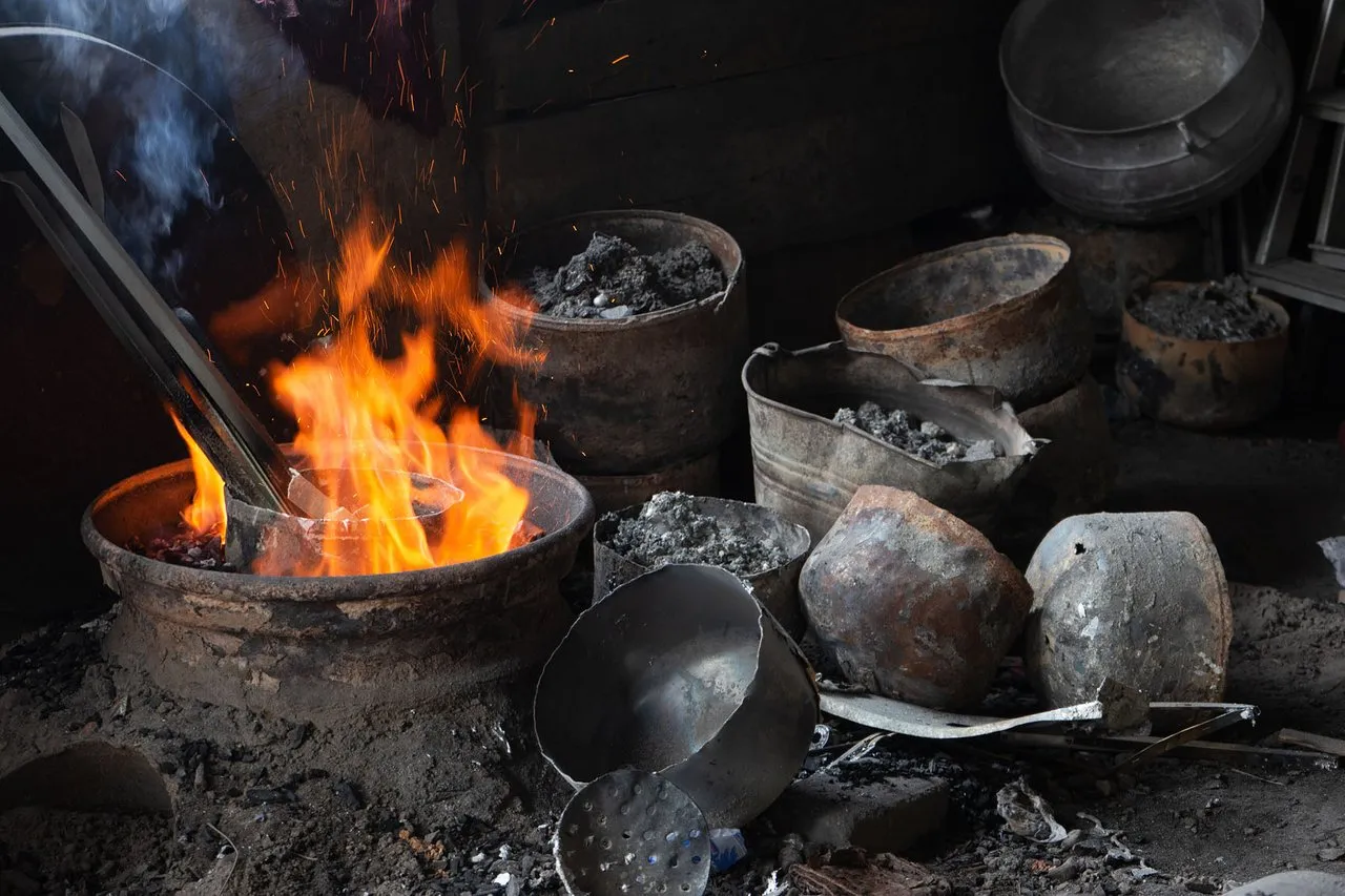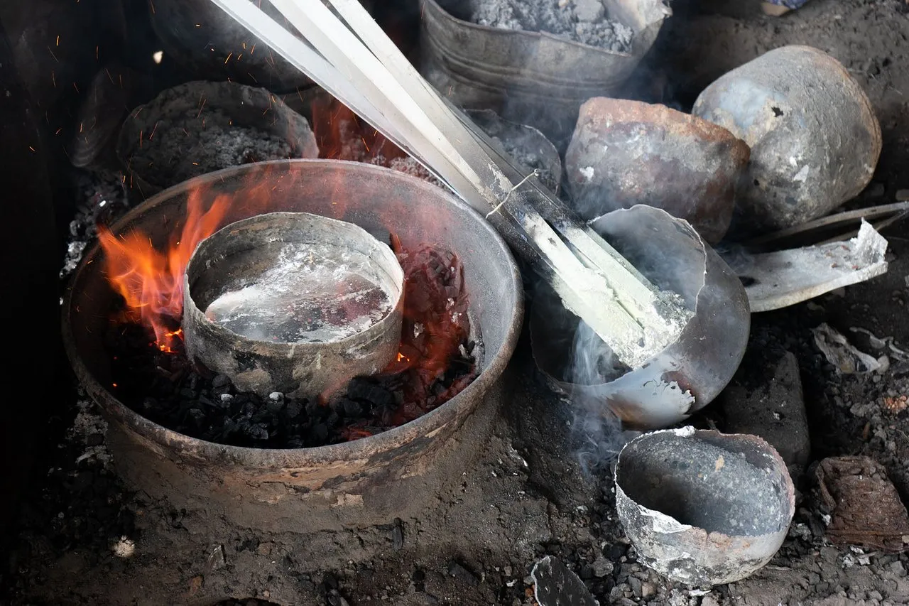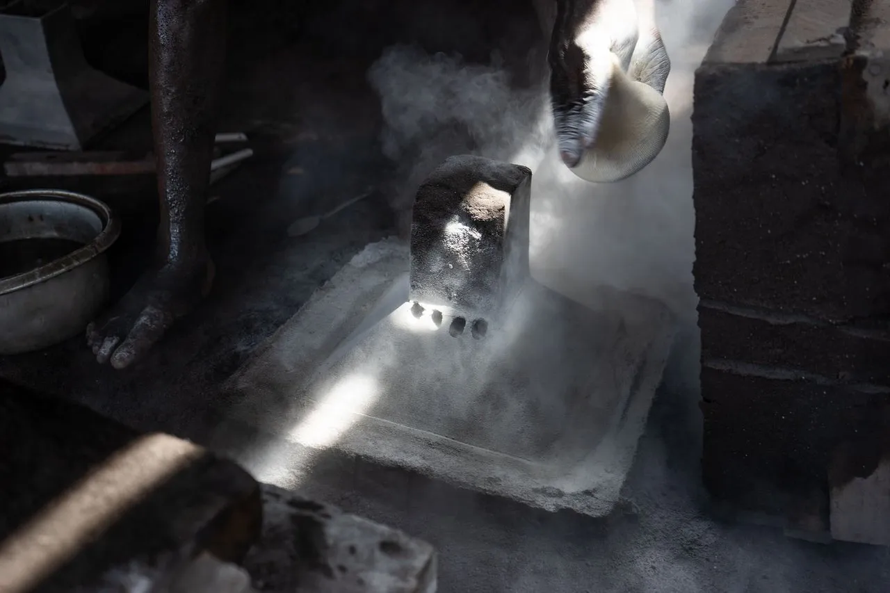 As the metal boils, they create molds by forming sticky sand around an already existing pot. These molds are then filled four at a time with the liquid metal. They cool for about ten minutes, get splashed with water to cool down. Then the mold is smashed, revealing the finished pot, which is subsequently polished. And because the mold has been trashed as part of this process, they have to create new ones every time.