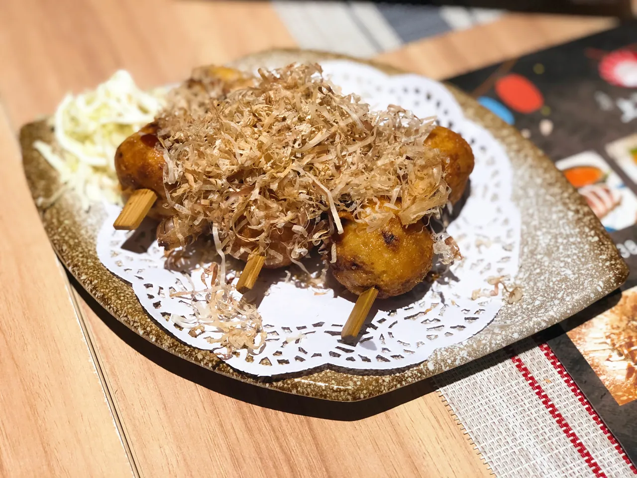 我把章鱼小丸子分为四层,一是随意覆盖在丸子之上的柴鱼片,其带有淡淡的海鲜味和咸味,提升了丸子的味道;二是章鱼小丸子的表皮,一定要酥脆才好吃;三是内里的山药泥,使丸子带有适度的清香味;四就是章鱼了,章鱼让丸子富有海鲜味。
