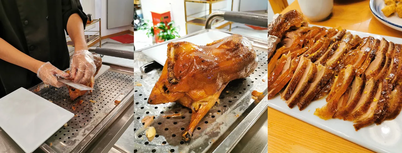 首先是切烤鸭师傅的刀工,刀工越好越有赏心悦目的体验感,还可以提升顾客食欲。其次就是切的时间,本身烤鸭一端上来就不断在降温,如果师傅动作利落,食客们品尝到的烤鸭就会更美味。