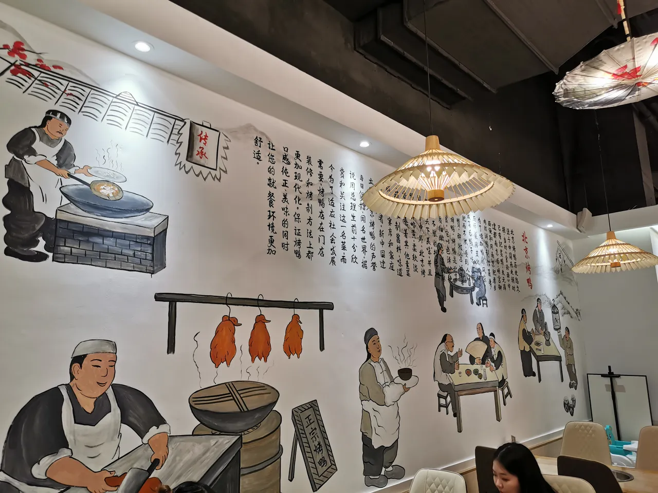 首先谈谈烤鸭店的装潢,整体来说偏中式。桌椅都用了木色,顶上的吊灯是油纸伞的造型,有种杭州的味道。