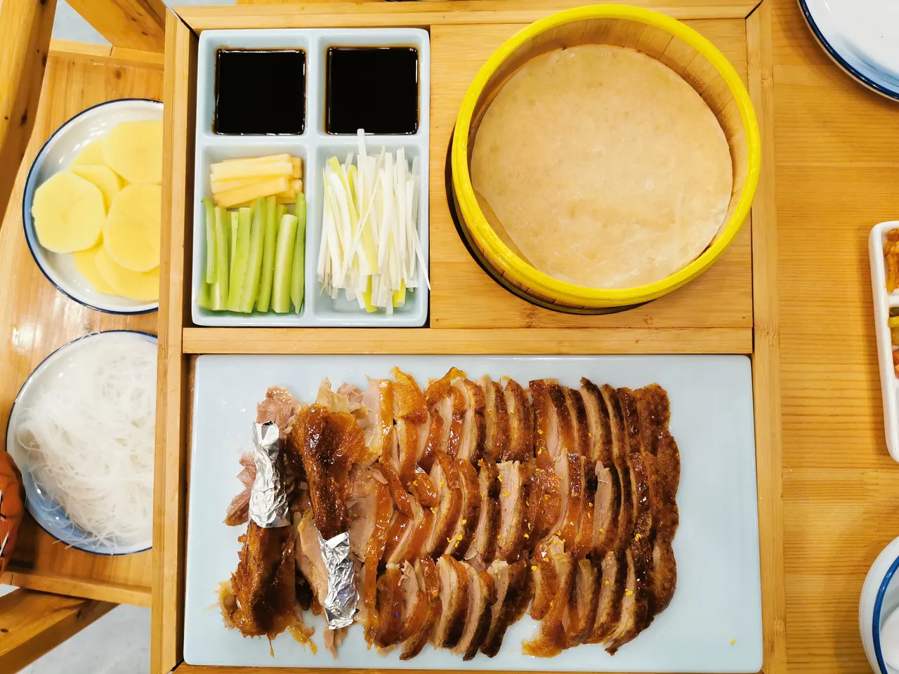 讲到摆盘,这家店还是比较有颜值的,用精致清新的木质餐盘,分为配料、烤鸭、面皮三个部分,格调是有的。