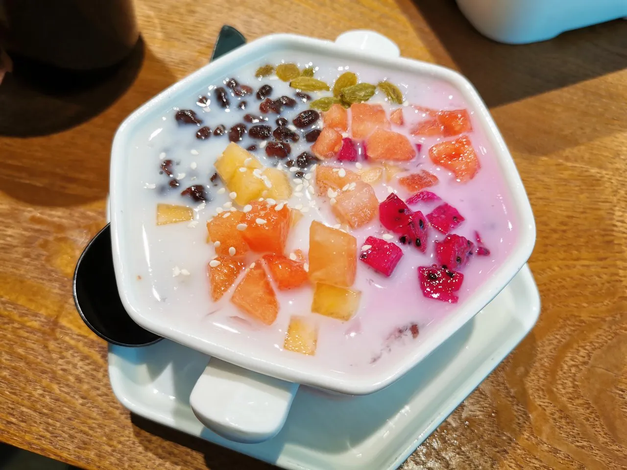 它由椰汁、冰粉、红豆、葡萄干、火龙果、苹果等食材构成,甜味适度,推荐。