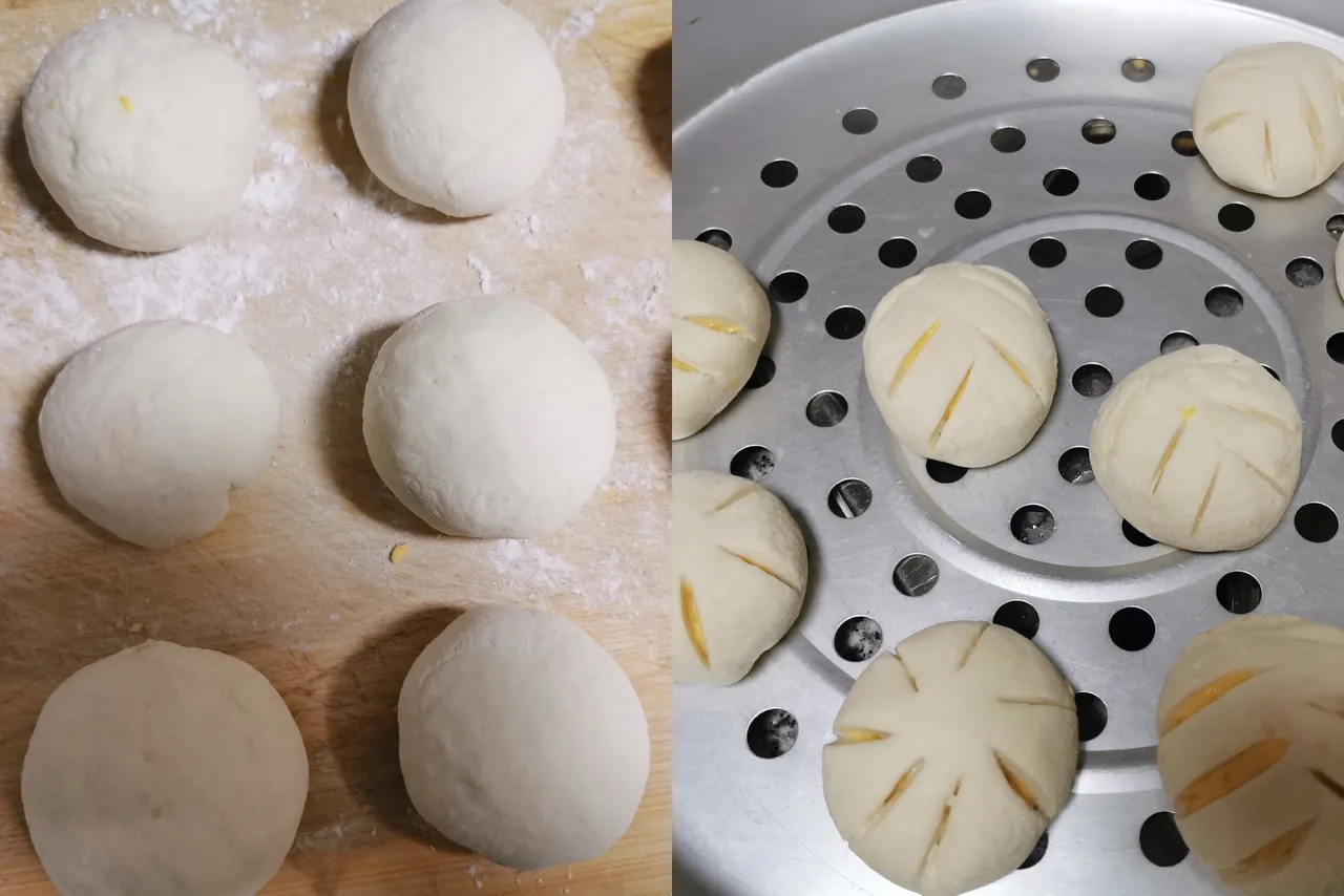 将南瓜面团揉成比乒乓球略小的球状,将白面团切成如乒乓球大小的不规则团状并擀成包子皮。再用包子皮完全裹住南瓜面球,并将包子皮粘合处固定好。