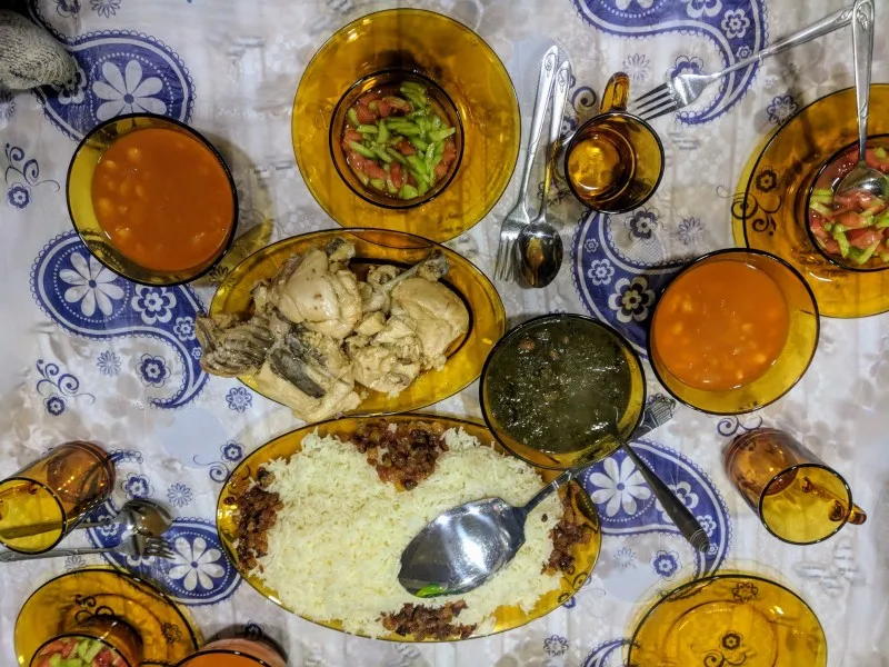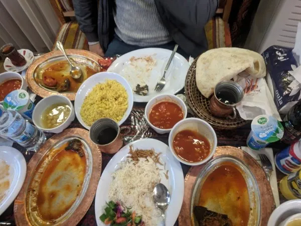 在与我们的主办SAROO的餐厅,桌子上没有足够的空间留下了食物,所以我们不得不对半个吃的两天再见。一切都很好吃,但不幸的是,我们不能在桌子上吃每一个单一的东西。我们的主持人说,一些食物将被用来帮助附近的难民营。
