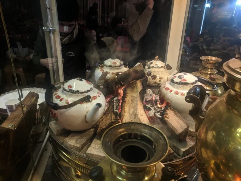 It's a huge tea drinking culture here. Drinking socially on the street is a popular way to hang out with friends. Making tea with wood fire is popular in Sulaymaniyah, often with beautiful display of the fire and teapot. They love their tea strong so they have lots of sugar too! We have learned to ask for tea without sugar (chai bei seker).